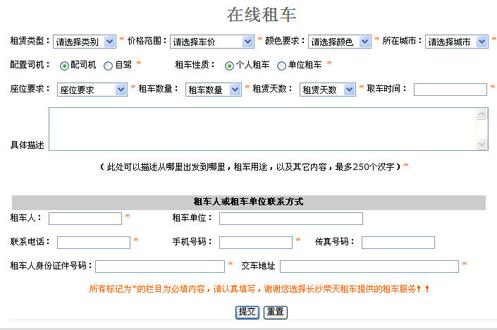 3、選擇或認(rèn)真填寫帶"*"的欄目,尤其是租車人或租車單位的詳細信息。認(rèn)真填寫上述必填信息將有助于我們及時和您取得聯(lián)系。